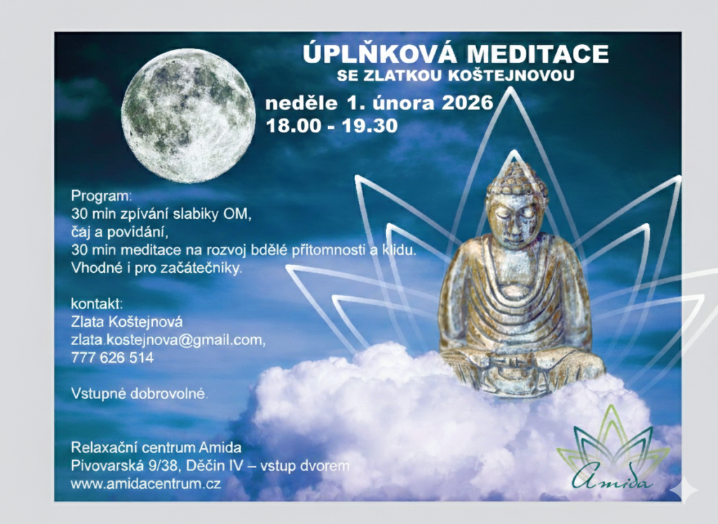 Vykročte do roku 2026 s čistou myslí. Po rok a půl dlouhé odmlce se se Zlatkou vracíme k našim pravidelným úplňkovým meditacím. Přijměte pozvání na lednové meditační setkání v prostorách Relaxačního centra Amida. Úplňková meditace je příležitostí k zastavení, vnitřní očistě a načerpání nové energie do startu nového roku.