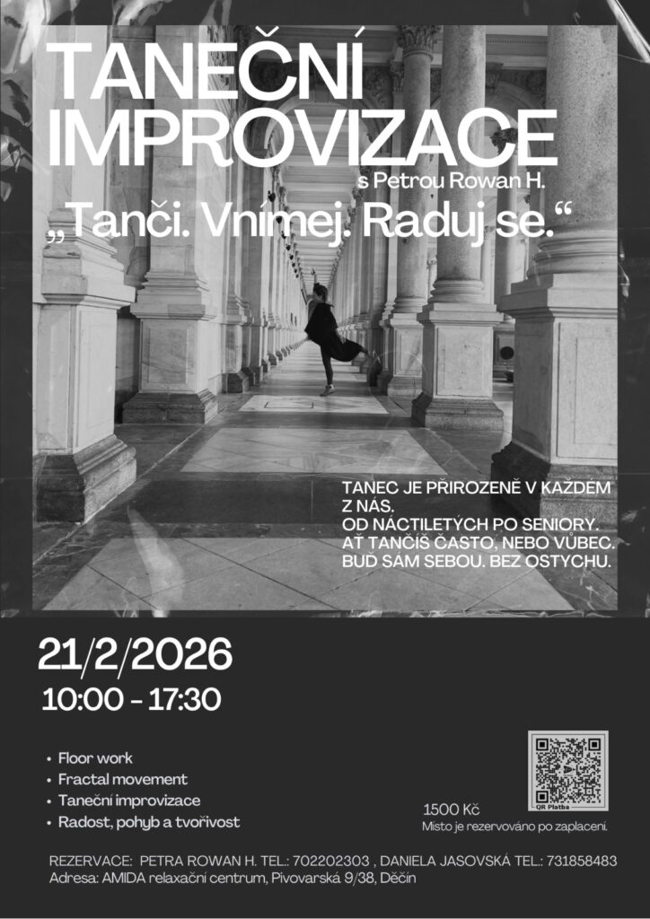 Přijďte v sobotu 21. února 2026 objevovat radost z pohybu a vlastní tvořivost. Workshop taneční improvizace je určen pro každého – od náctiletých po seniory, pro zkušené tanečníky i úplné začátečníky. Čeká nás floor work, fractal movement a prostor být sám sebou bez ostychu.