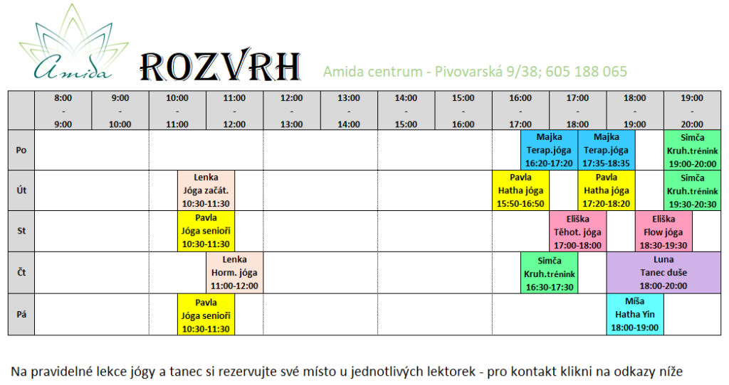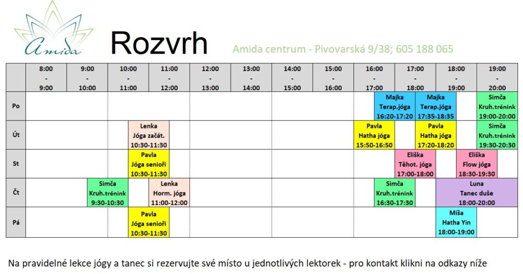 Rozvrh Lekce v Amidě od září 2025 Lenka – hormonální jóga a začátečníci Luna – tanec duše Majka – terapeutická jóga Pavla – HATHA jóga a senioři Simča – kruhový trénink eliška – těhotenská jóga a flow jóga